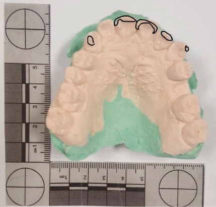 En caso de colectarse prótesis dentales, se las registrarán con fotos cuando están adaptadas en la cavidad oral y fuera de la misma, con testigo métrico (Carabott, 2013). Teniendo en cuenta las nuevas tecnologías, podrían efectuarse superposiciones 2D de fotografías AM y PM (Evans, 2014) o entre el modelo 3D de un determinado patrón dental y la imagen 2D (Franco et al., 2015). Se ha enfatizado en que la manipulación libre de modelos dentales digitales 3D en diferentes ejes es una ventaja, superando el análisis de imágenes 2D, destacando también la perspectiva realista de la imagen tridimensional (Tuceryan et al. 2009; Martin de las Heras et al., 2009; Sheets et al., 2011; Franco et al., 2015).