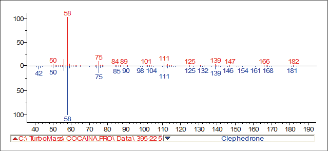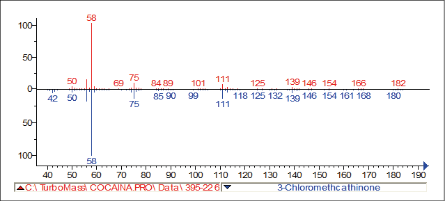 La Muestra 1, consistente en parte de un comprimido de color amarillo con forma y relieve similar a un átomo, que fue sometida a cromatografía en capa delgada de silicagel HF. Los resultados preliminares sugirieron la presencia de un principio químico derivado de anfetaminas. El análisis por GC-MS evidenció la presencia de un único principio activo que eluyó a 9.81 minutos, con un pico base de 58+. La comparación del espectro de masas obtenido con las bibliotecas teóricas arrojó una coincidencia del 92.6% con la 4-clorometcatinona (4-CMC). El cromatograma de la Muestra 1 se presenta en la Figura 1, su espectro de masas en la Figura N° 2, y la comparación del espectro con la 4-clorometcatinona (4-CMC) en la Figura N° 3.
