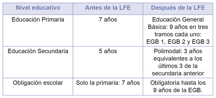 Entre las transformaciones que llevó adelante la LFE, podemos citar la creación de la Educación General Básica (EGB) y que extendió la obligatoriedad a nueve años de estudio. La EGB comprendía la anterior enseñanza primaria de siete años y sumaba los dos primeros años de secundaria, esta nueva estructura se organizaba en tres tramos. Por otra parte, lo que eran los últimos tres años de la antigua secundaria, pasaría a conformar el nivel denominado Polimodal, cuya duración también fue de tres años y que resultaba equivalente a esos últimos años de la secundaria tradicional (Tabla N° 1).