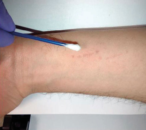 Figura N° 6. Hisopado de la huella de mordedura. Fuente: Gómez, C.Y., 2022.