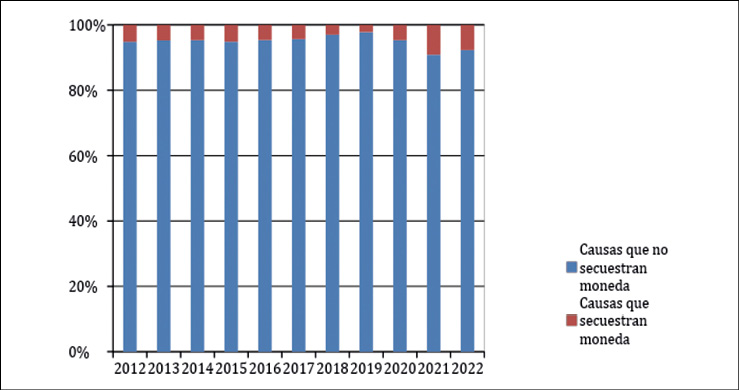 La evolución de la proporción de causas en que sí se secuestra moneda presenta cierta continuidad a lo largo de los años, manteniéndose siempre por debajo del 10 por ciento. Los años 2021 y 2022 exhiben, sin embargo, un crecimiento con relación a los anteriores. El Gráfico N°3 muestra en color rojizo esa proporción.