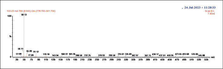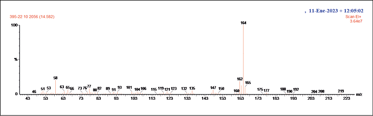 Figura N° 13. Espectro de masas de la sustancia con tiempo de retención 14.58 minutos.