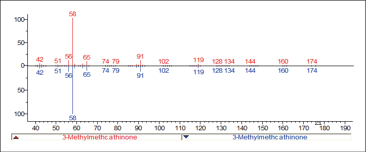 La Muestra 2, parte de un comprimido de color violeta con la inscripción parcial “EN” en bajo relieve, también mostró resultados preliminares de TLC que indicaron la posible presencia de un principio químico derivado de anfetaminas. Mediante GC-MS, se detectó un principio activo a los 9.84 minutos con un pico base de 58+. Este compuesto tuvo una coincidencia del 92.2% con la 3-clorometcatinona (3-CMC) al compararlo con las bibliotecas teóricas. La Figura N° 4 muestra el cromatograma de la Muestra 2, la Figura N° 5 su espectro de masas, y la Figura N° 6 la comparación del espectro con la 3-clorometcatinona (3-CMC).
