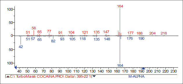 Figura N° 15. Comparación del espectro de masas del compuesto eluído a 14.58 minutos con el del M-ALPHA.