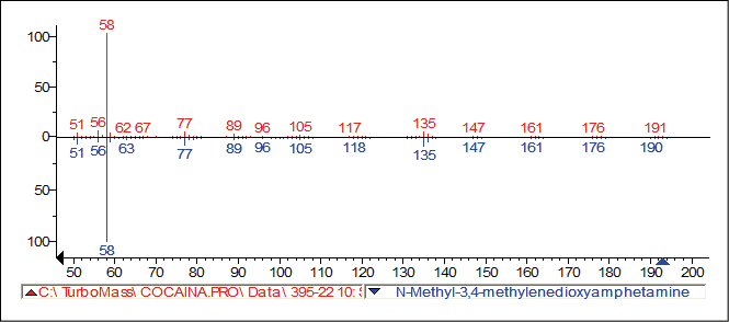 Figura N° 20. Comparación del espectro de masas del primer compuesto y el del MDMA.