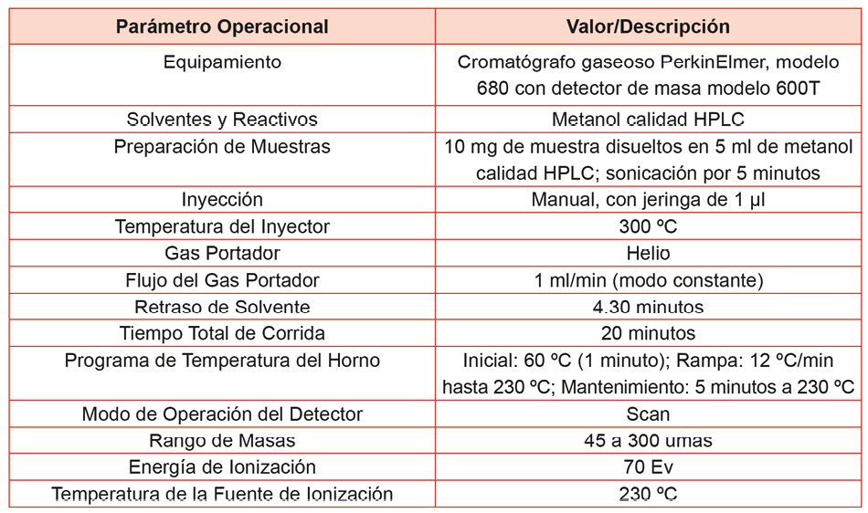Los parámetros operacionales específicos del equipo de GC-MS utilizado son cruciales para la reproducibilidad de los resultados. Estos se detallan en la Tabla N°1.